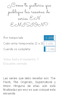 ¡Muchas gracias a todos por votar! Lo que he decidido es hacer algunas series por temporadas (The Flash, The Originals y Arrow) y hacer las más avanzadas cuando terminen (como Supernatural, ya que tiene muuuuchas temporadas y hacer una reseña por cada una será mucho). ¿Qué les parece?