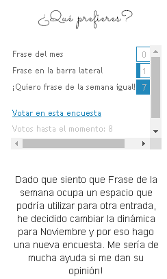 • Frase de la semana: en la barra lateral dejé una encuesta para esta sección. La hice porque me ocupa una entrada por semana que podría utilizar para otra cosa y quería saber lo que pensaban. Los resultados hasta ahora demuestran que les encanta la sección y que la quieren como está
